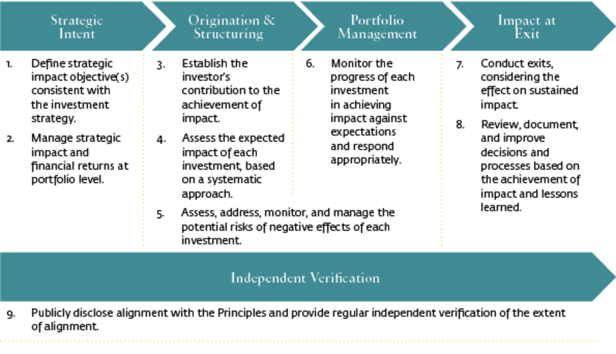 The Principles do not stipulate what impact is, but provide a standardized framework to evaluate how different asset managers incorporate impact in their practices. Signatories commit to integrating impact management best practice throughout the entire investment lifecycle, from strategy to deal sourcing to exit or repayment, and ensure that lessons learned are continuously incorporated into portfolio management.