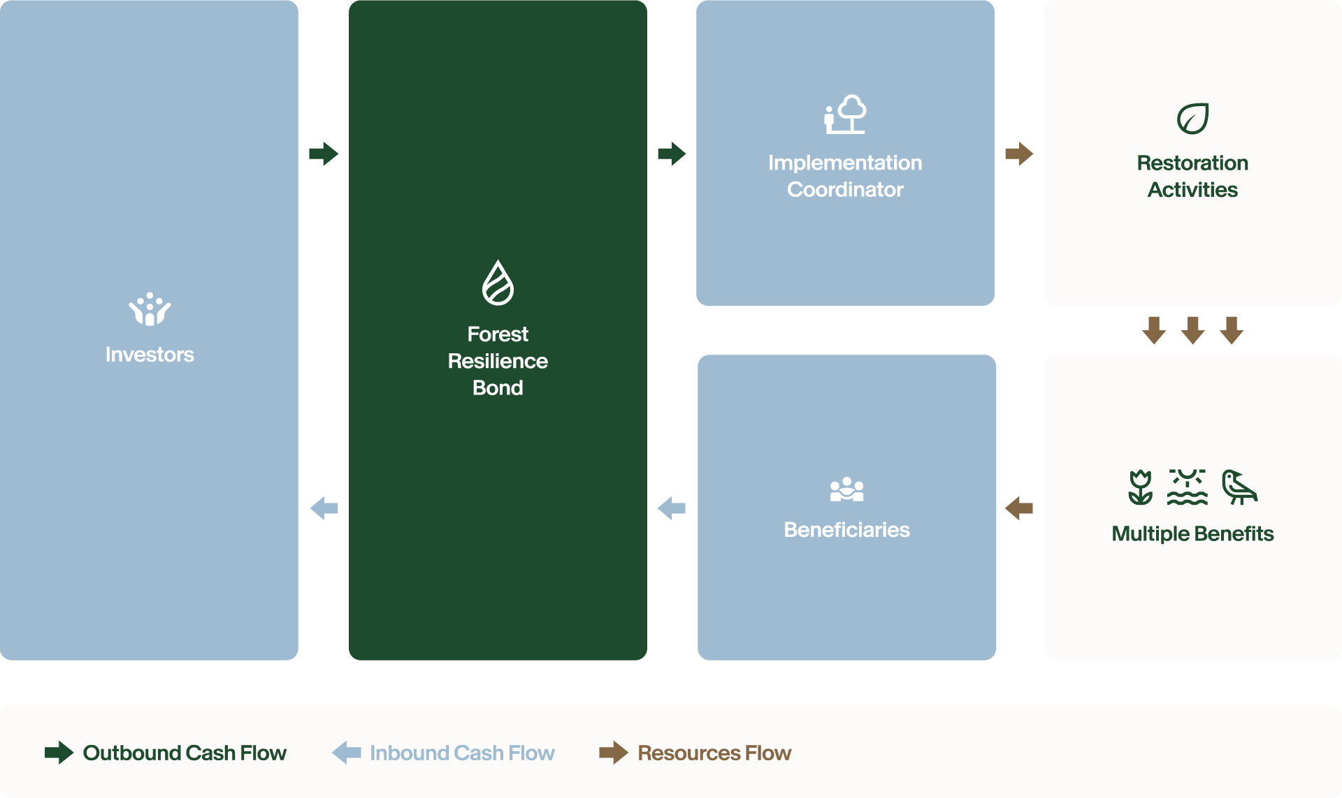 The FRB financing structure is a public-private partnership that uses private capital to ease cash flow constraints. Using this model, multiple groups share the costs of forest restoration. Here is how the FRB model works: